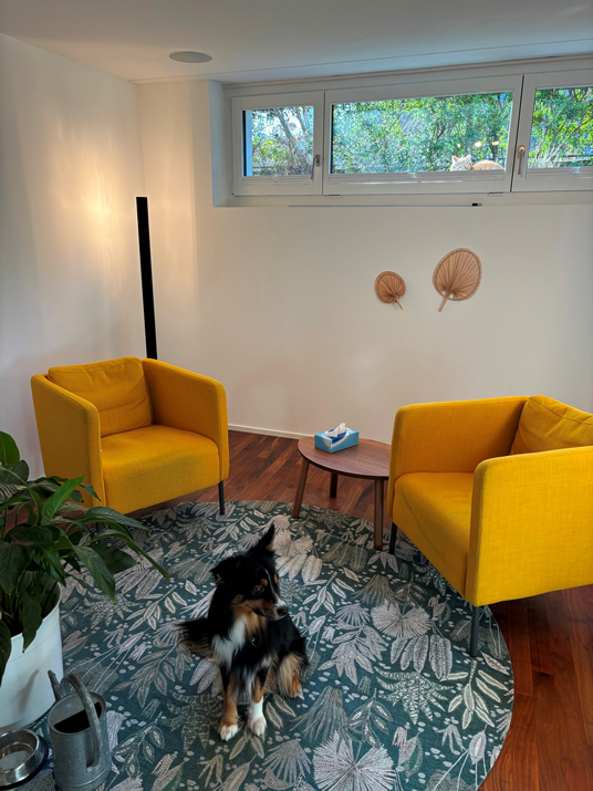 Mein Hund Kiro ist in der Regel bei der Arbeit mit dabei. Er ist jedoch nur Zuhörer und bleibt für sich an seinem Platz.